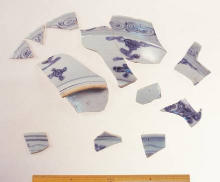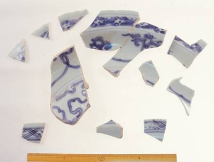 そして、それらの中に景徳鎮窯で焼かれたと推定される外径31センチを超える「染付玉取獅子紋稜花大皿」の破片が12片出土した。この染付大皿は、見込の二重円圏内に大小4匹の獅子が配置され、それぞれが玉紐をとる玉取獅子紋様が描かれているもので管見の限りわが国では出土例がない貴重な大皿である。