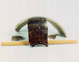 2)15世紀中頃(1450年頃)の編年をもつ根来型鉄釉瓶子(酒器と使用)堀底直上層より。常滑窯産の大甕の胴部破片。